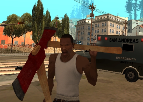 Теперь CJ может драться сразу двумя катанами одновременно, плюс к моду идет новая анимация, что бы было интереснее играть. Вы не смотрите, что на моих скриншотах в руках у ГГ топоры, это я просто заменил на топоры, у вас будут стандартные катаны, ну или те, что в архиве.