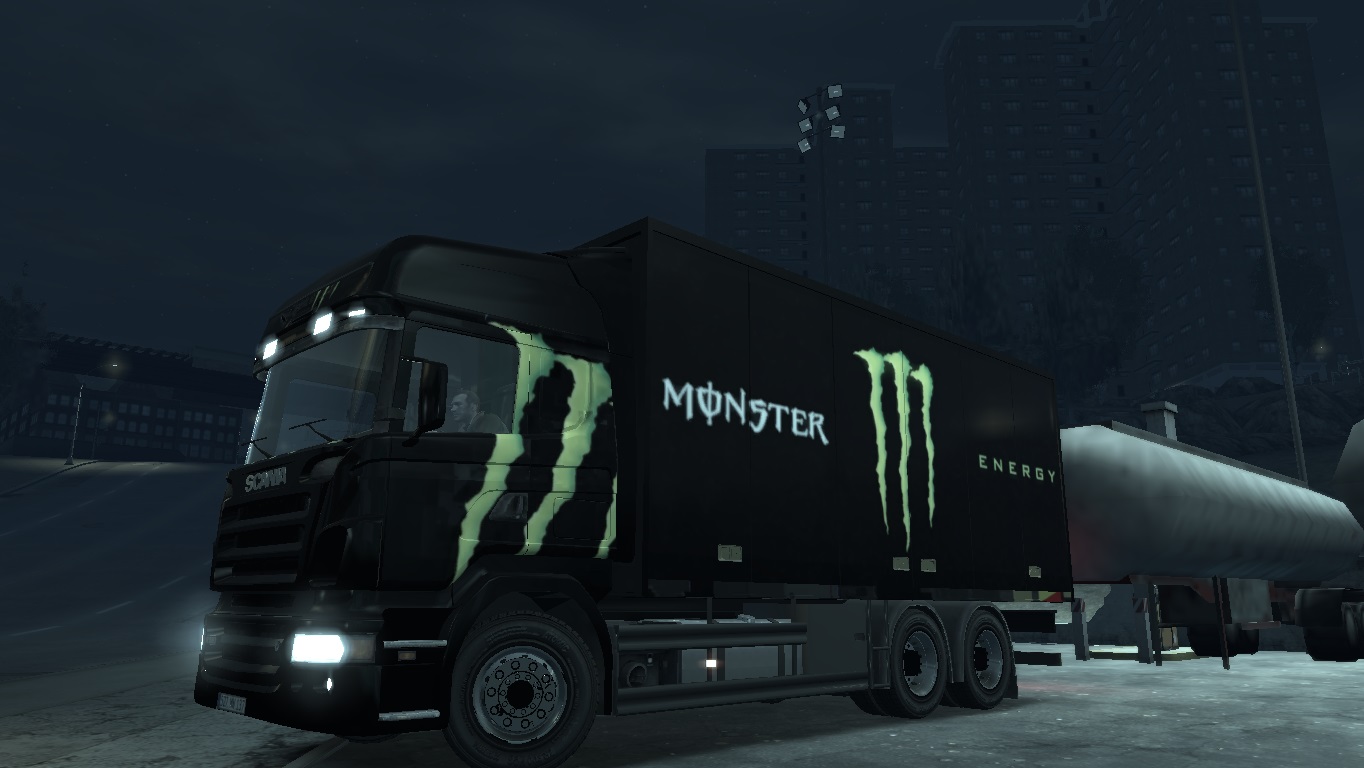 Данный мод добавляет в GTA 4, крутой, большой грузовичок Scania, с логотипом Monster Energy, теперь скачав его вы можете крушить всё вокруг, ну или же просто покататься на большой машине. Модель очень качественная, всё работает, подвеска, фары, так-же на модели отображается грязь, следы пуль, трещины, вмятины, и др.